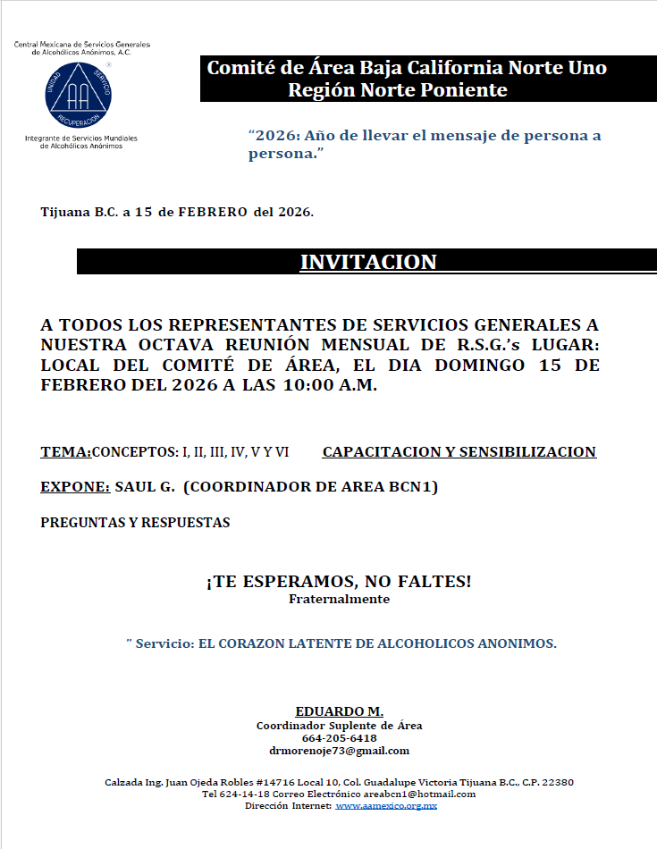 INVITACION A TODOS LOS RSG’S A NUESTRA OCTAVA REUNIÓN MENSUAL. 1 feb Escrito por Salvador Ramirez LOCAL DEL COMITÉ DE ÁREA, EL DIA DOMINGO 15 DE FEBRERO DEL 2026 A LAS 10:00 A.M. Salvador Ramirez